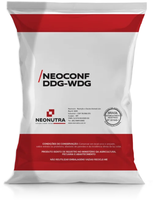 Neoconf DDG-WDG deve ser misturado em nível de 2% com base na matéria seca dos alimentos que compõem a dieta total, ou conforme recomendação técnica. Neoconf DDG-WDG é um núcleo desenvolvido para o preparo de dietas para animais confinados e semiconfinados, que tem inclusão de coprodutos da indústria de etanol de milho (DDG e WDG) na dieta.